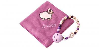 Grâce à ses nombreuses couleurs et au nom brodé (max: 10 symboles) votre doudou et votre attache-tétine seront unique!